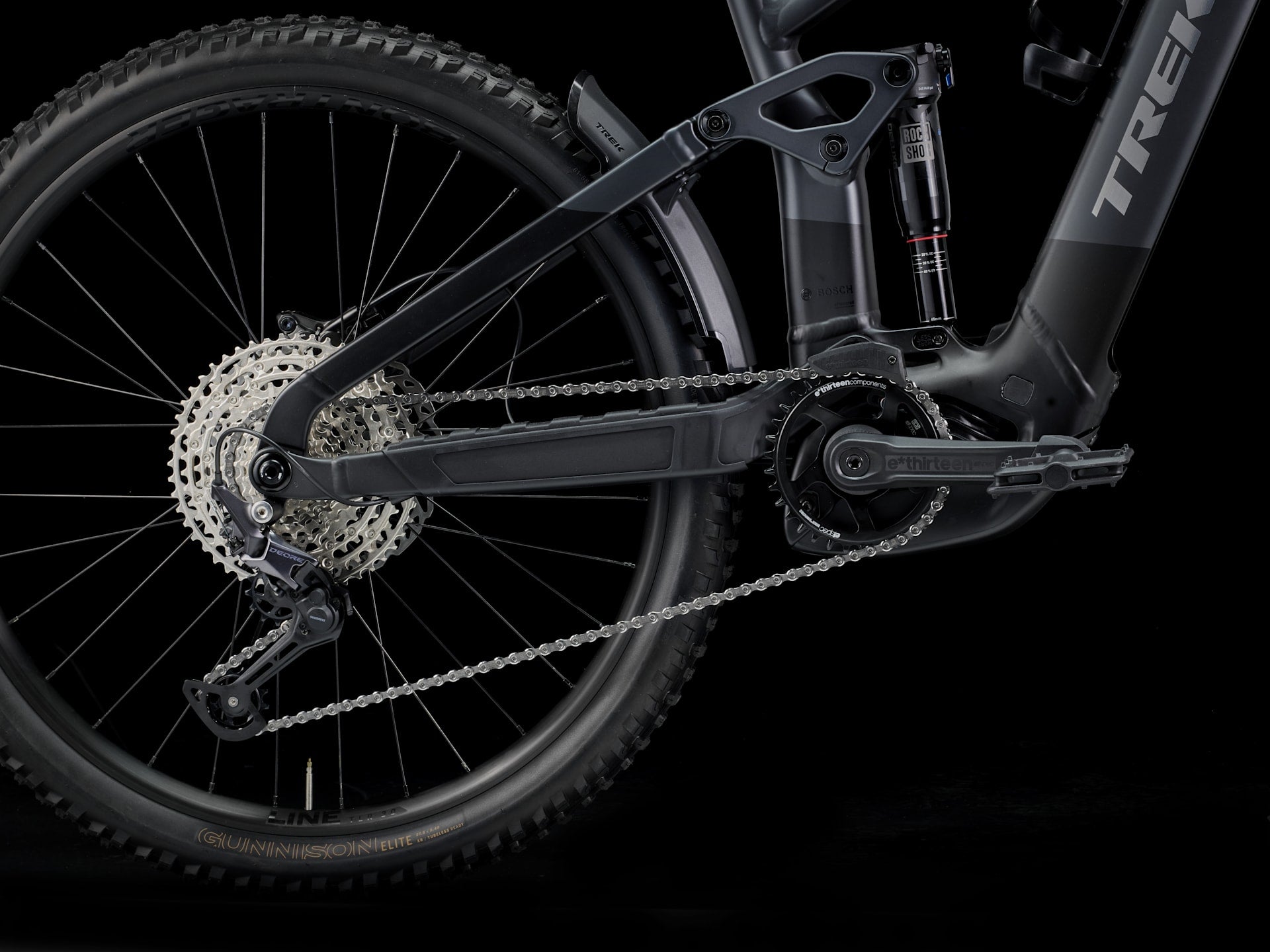 The Rail+ 5 is an alloy enduro e-bike that delivers huge value for big adventures. Its rugged Alpha Platinum Aluminium frame partners with a RockShox Deluxe Select+ RT shock and Psylo Gold RC fork (160 mm rear/front) to charge through the roughest terrain on the mountain. A Shimano Deore 12-speed drivetrain and 4-piston MT4100 brakes deliver clean shifting and brake modulation that doesn't break the bank. It's topped with a TranzX dropper post and tubeless-ready Bontrager Line TLR 30 wheels for charging into anything.